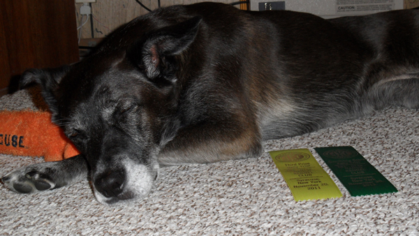 Risa, exhausted from a great weekend, posing with her 3rd place and qualifying ribbons.