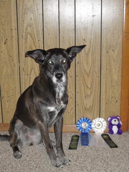 Risa with her New Title rosette, Fourth Place rosette, and qualifying ribbons.
